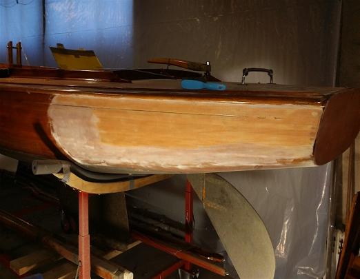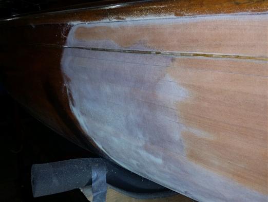 - Boot außen, innen, Deck, Unterwasserschiff und Kiel abschleifen. Hierfür beginnen wir mit dem Exzenterschleifer mit 40er Schleifscheiben, danach 80er und zum Schluß 120er bis der alte Lack komplett abgeschliffen ist und das blanke Holz ansteht. Ecken und Winkel werden mit Ziehklinge bearbeitet. Danach das ganze Boot im Hand-Schleif-Verfahren glatt schleifen um etwaige Schleifspuren der Maschine zu ebnen.
